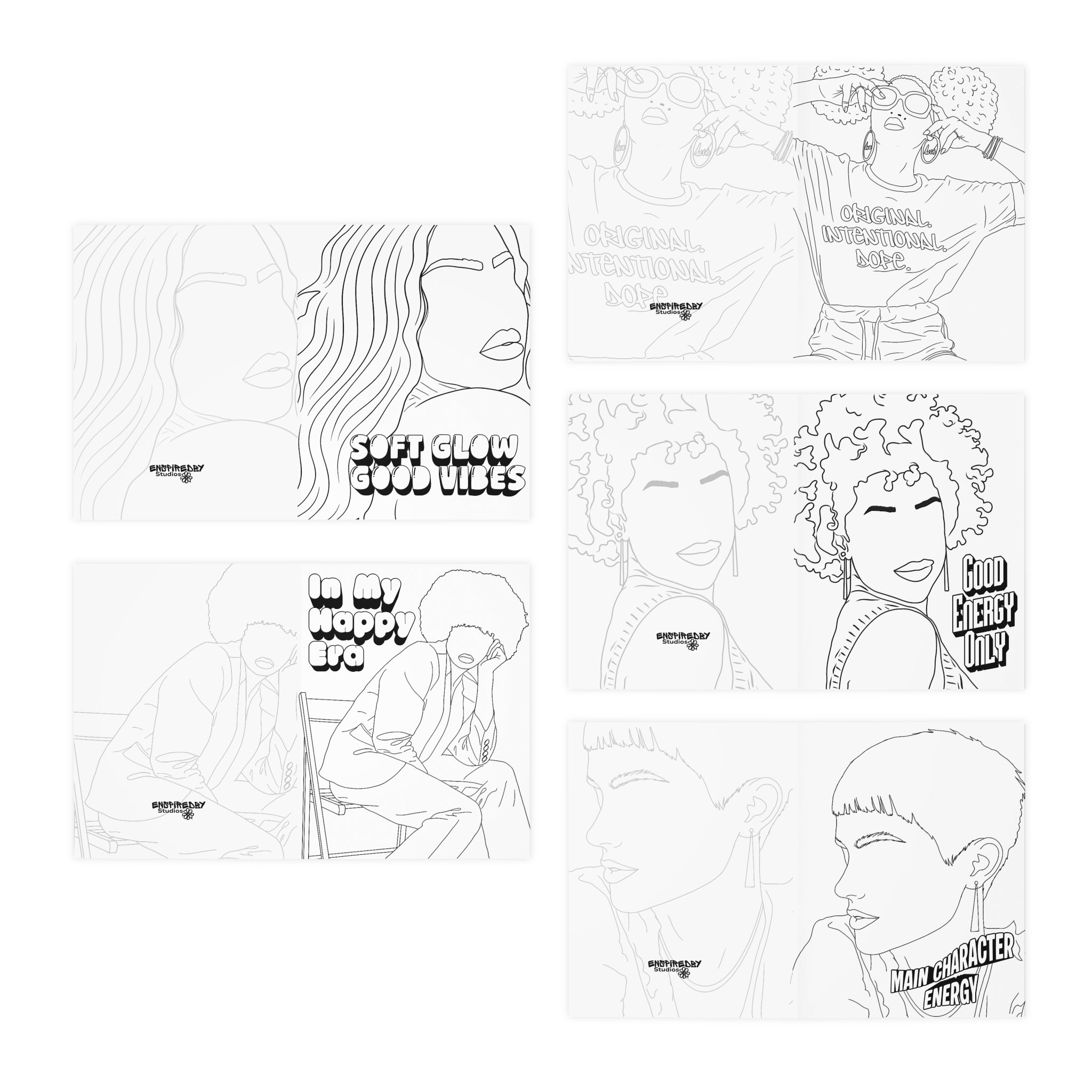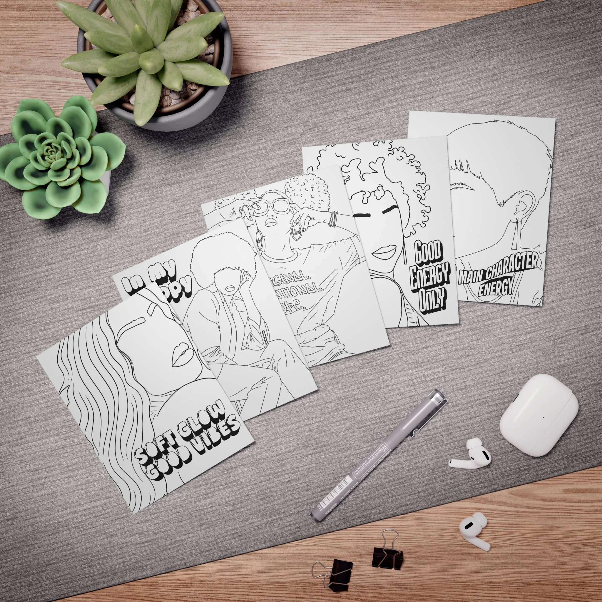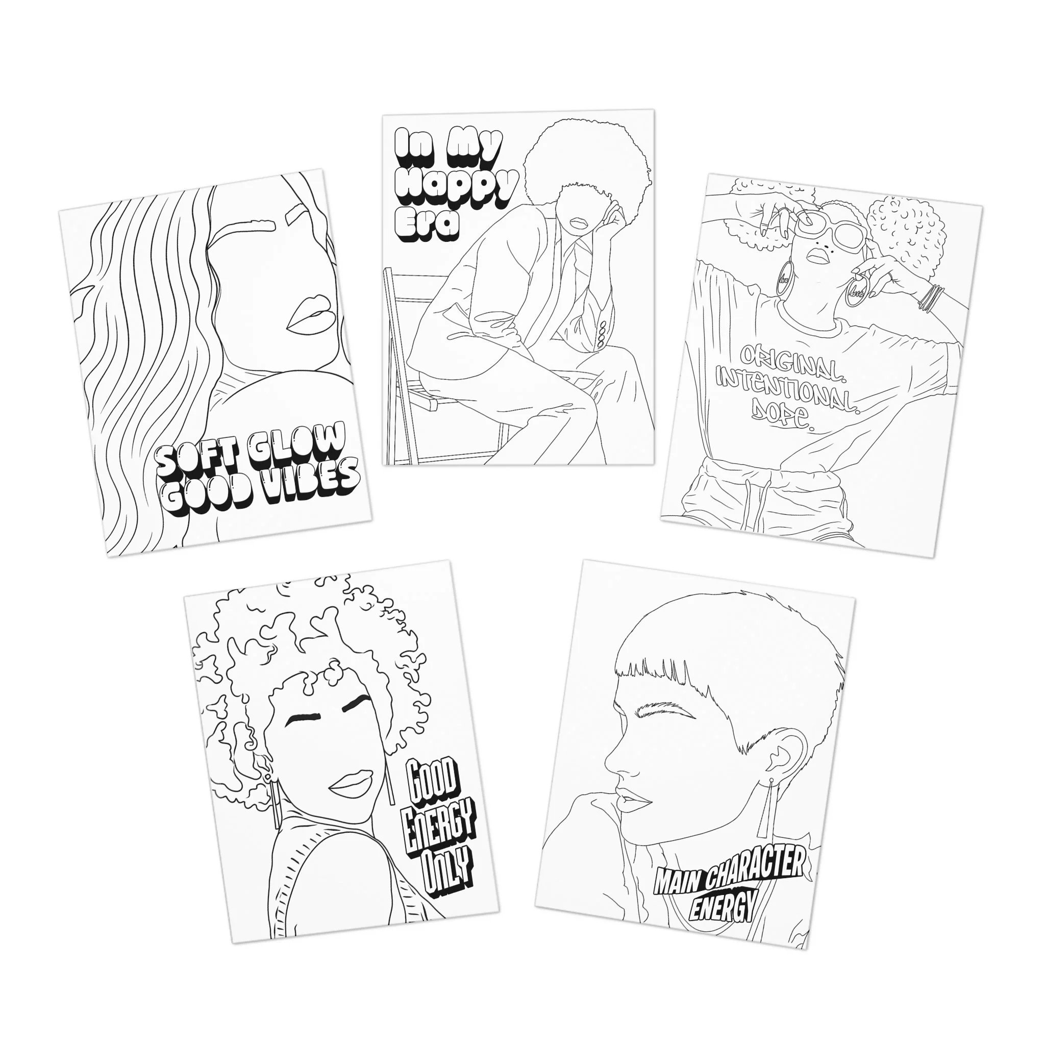 A set of five artful greeting cards that feel like a mini zine for anyone who lives for bold vibes and self-expression. Each card features a single-line, hand-drawn portrait with room for you to color or keep as minimalist black-and-white; playful, retro-inspired lettering calls out moods like “Soft Glow Good Vibes,” “Main Character Energy,” and “In My Happy Era.” The uncoated heavyweight paper takes ink and markers beautifully, and the crisp printing keeps lines and text sharp whether you add color or leave them stark. These cards arrive with matching white envelopes and a subtle overlap front cover that keeps the design clean and gallery-ready. Thoughtful, tactile, and made in the USA, the pack invites note-writing, custom messages, and little acts of encouragement for friends, roommates, or yourself.